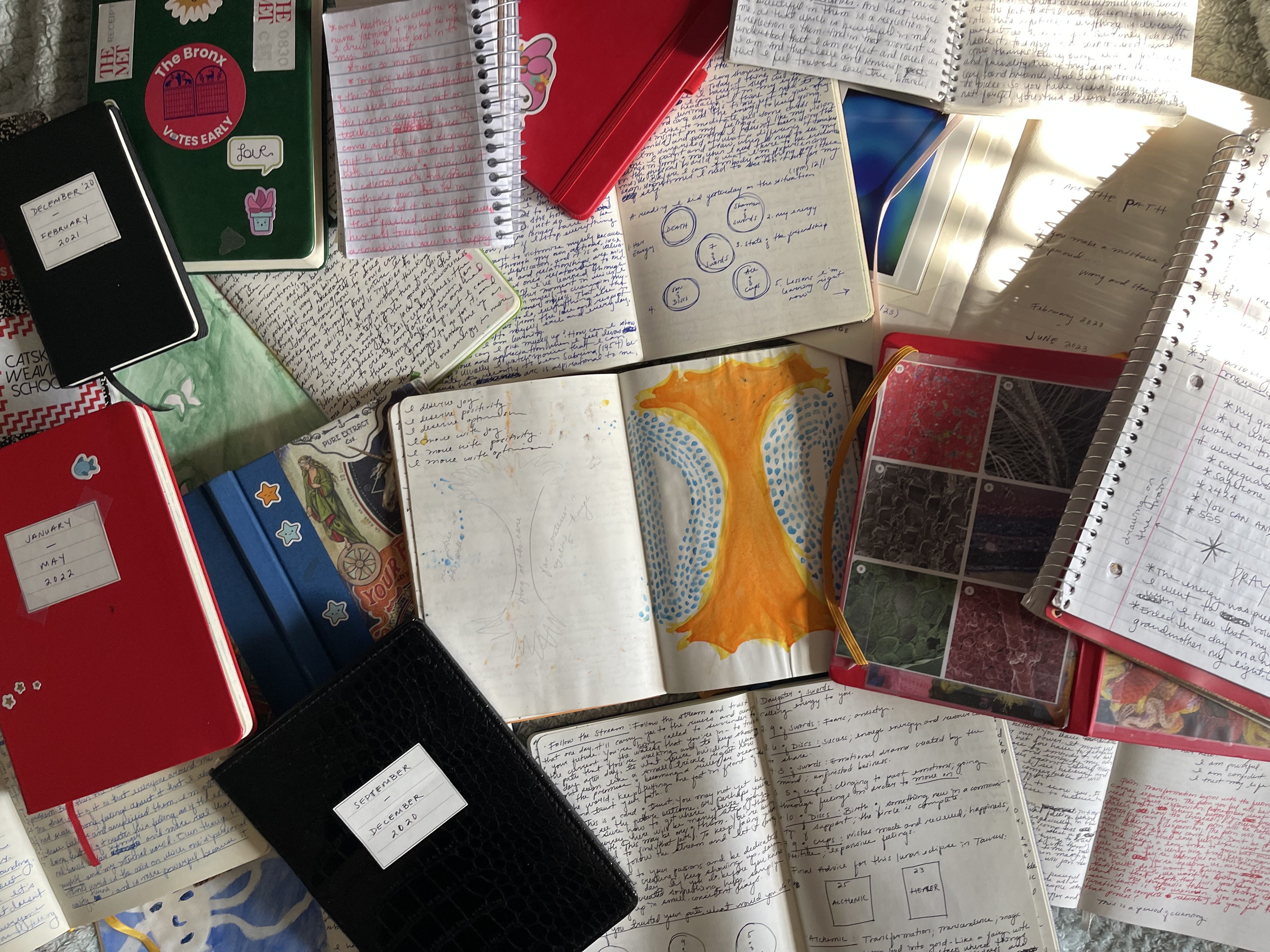 Today there are 23 notebooks collected over a period of five years. From dream interpretations and ancestral messages, to tarot spreads and nature walks, these journals have become my most valuable possession. The pages, in all their raw and slightly incoherent glory, have allowed me to form a real relationship with my mind, and become the architect of my own reality.