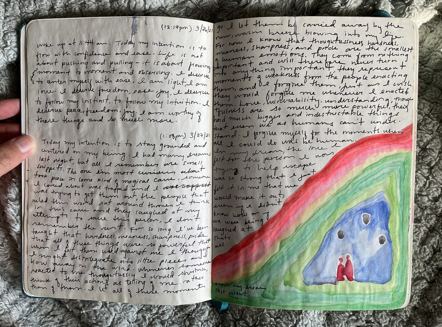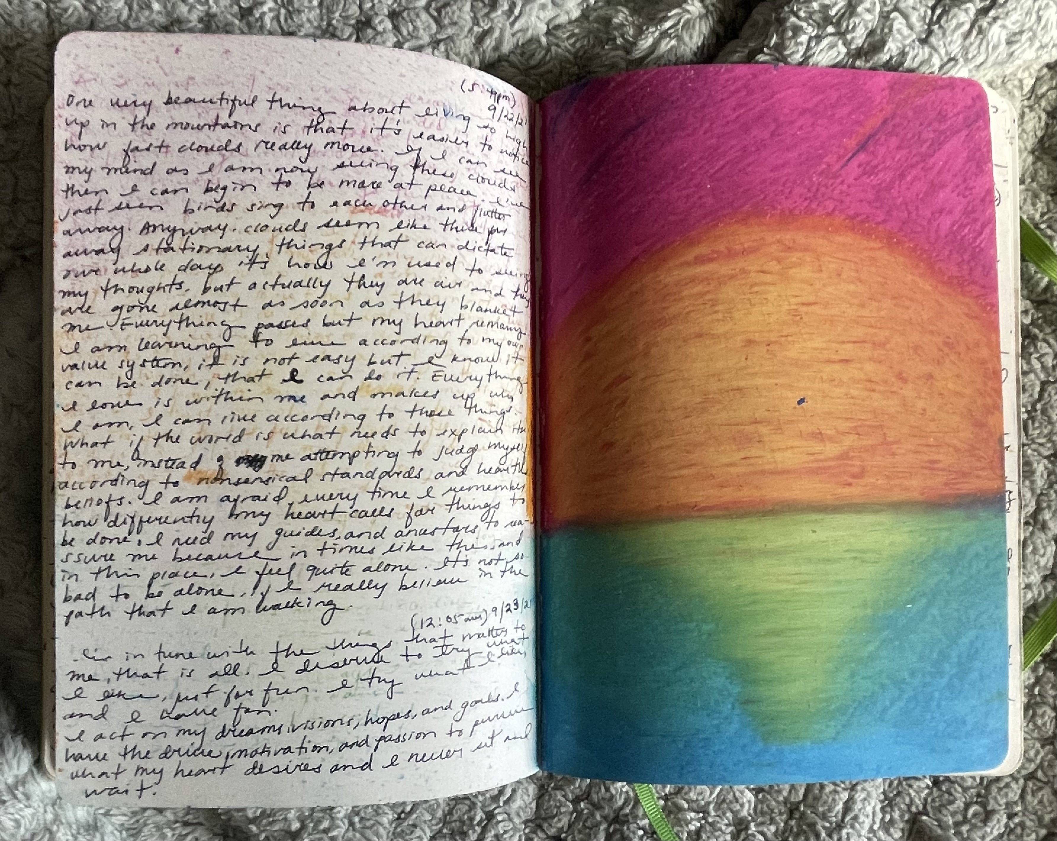 The writing itself is less jagged and flat. My handwriting is better, and the thoughts are longer. I started being able to connect different experiences and assemble them into larger themes. The pace is less urgent and more reflective. I took more space and time to put the pieces together. I began to write gratitude lists and take note of the things I enjoy. I started to paint and write about nature.