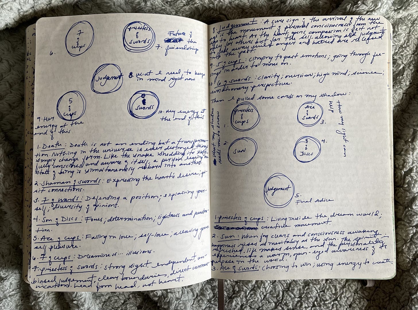 From those pages, in which I usually recount my dreams or events from the day before, I extracted the relevant dream symbols, motifs, and thematic patterns that kept showing up in life, into a large spiral notebook, where I expanded on the connections I noticed, and added external research. There are a lot of empty spaces for drawings I never did.